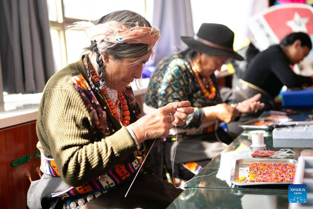 Members of a handicraft cooperative make "Lucky Dolls" in Baihe community of Tangke Town in Ruoergai County, southwest China's Sichuan Province, Aug. 24, 2023. (Xinhua/Wang Yijie)