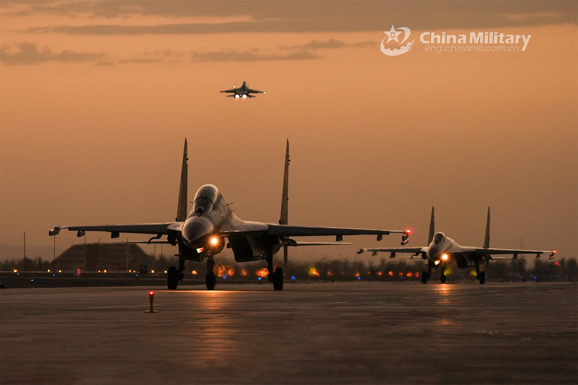 Two fighter jets attached to the PLA Air Force Xi'an Flying College taxi on the runway in close formation as another fighter takes off from the flightline during an around-the-clock training mission on August 19, 2023. (eng.chinamil.com.cn/Photo by You Yanwei)