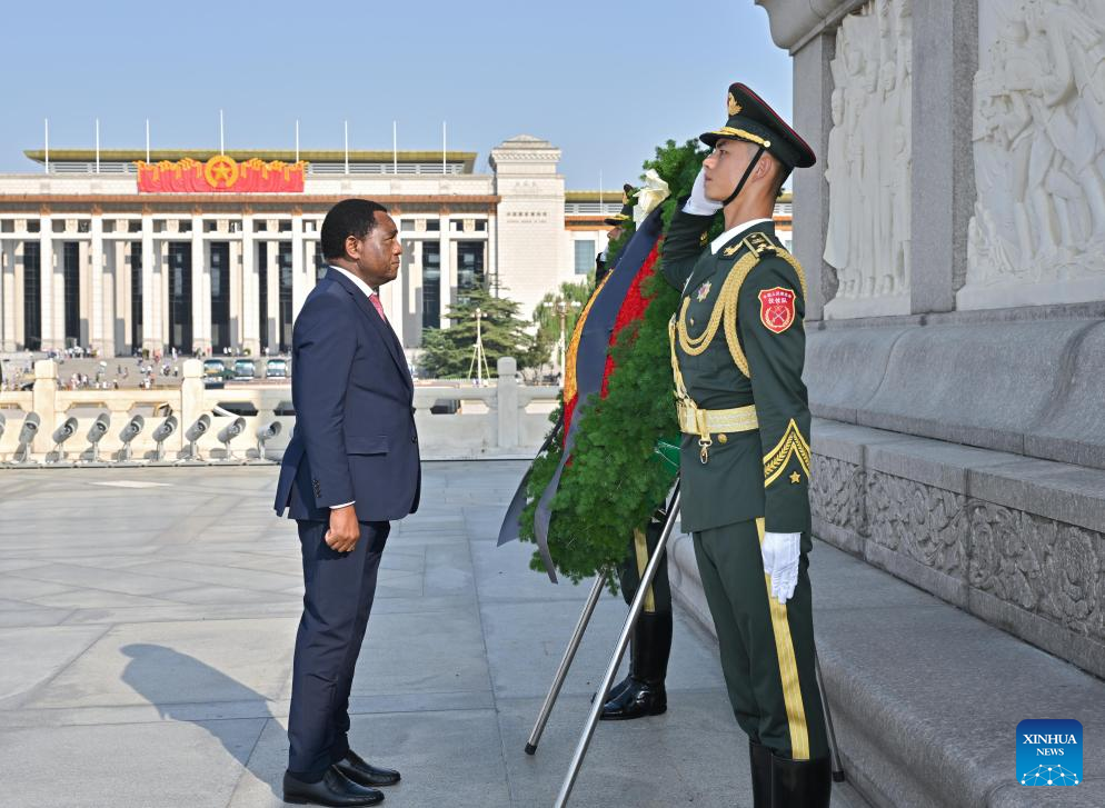 Zambian President Hakainde Hichilema lays a wreath at the Monument to the People's Heroes on the Tian'anmen Square in Beijing, capital of China, Sept. 14, 2023. (Xinhua/Yue Yuewei)