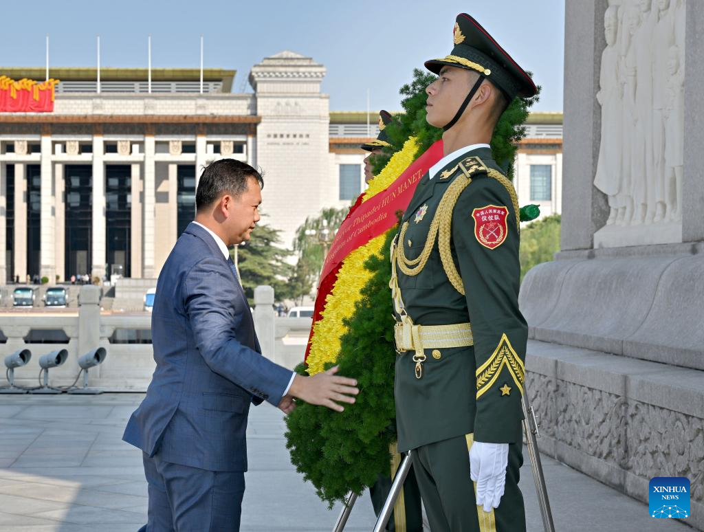 Cambodian Prime Minister Hun Manet lays a wreath at the Monument to the People's Heroes on the Tian'anmen Square in Beijing, capital of China, Sept. 14, 2023. (Xinhua/Yue Yuewei)