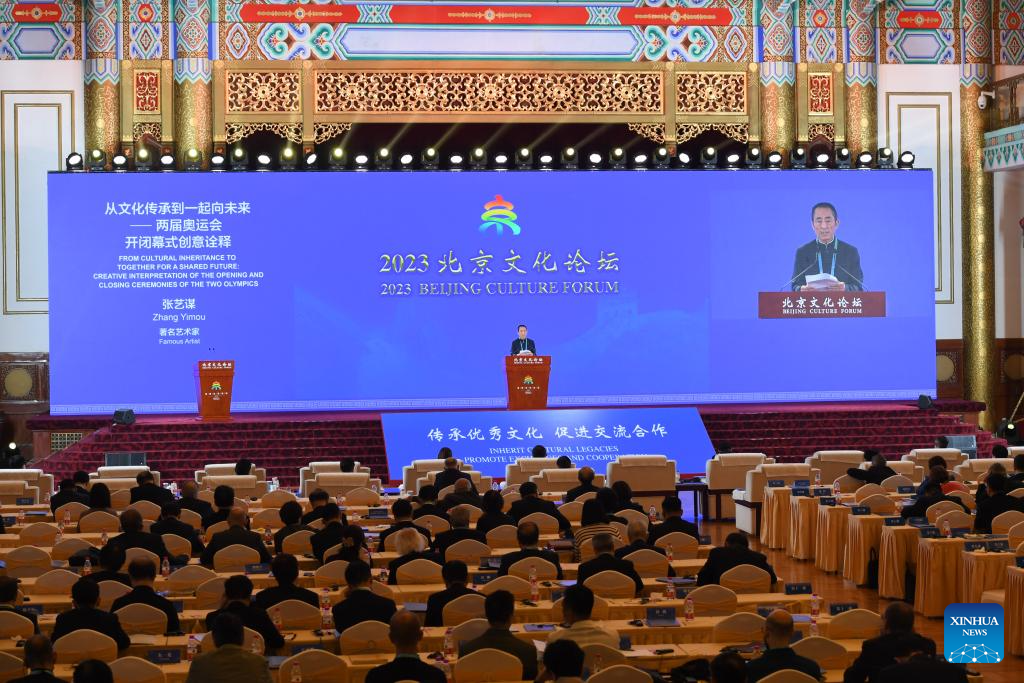 Artist Zhang Yimou delivers a speech at the 2023 Beijing Culture Forum in Beijing, capital of China, Sept. 14, 2023. The 2023 Beijing Culture Forum opened on Thursday in Beijing. (Xinhua/Ju Huanzong)