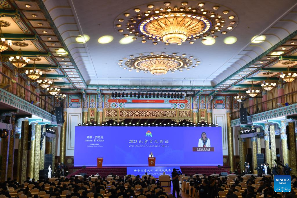 Nevien EI Kilany, the Egyptian minister of culture, delivers a speech at the 2023 Beijing Culture Forum in Beijing, capital of China, Sept. 14, 2023. The 2023 Beijing Culture Forum opened on Thursday in Beijing. (Xinhua/Ju Huanzong)