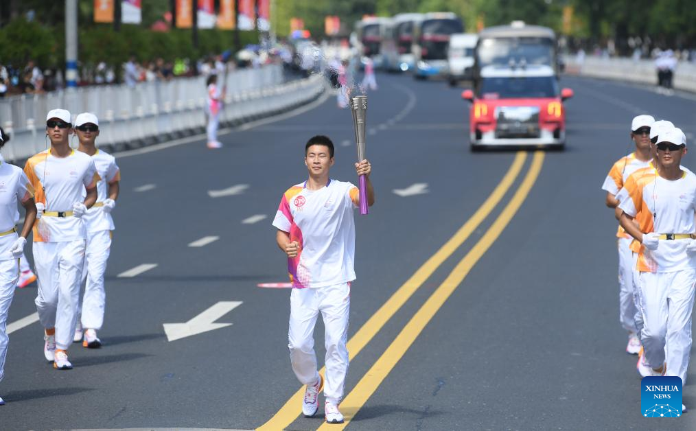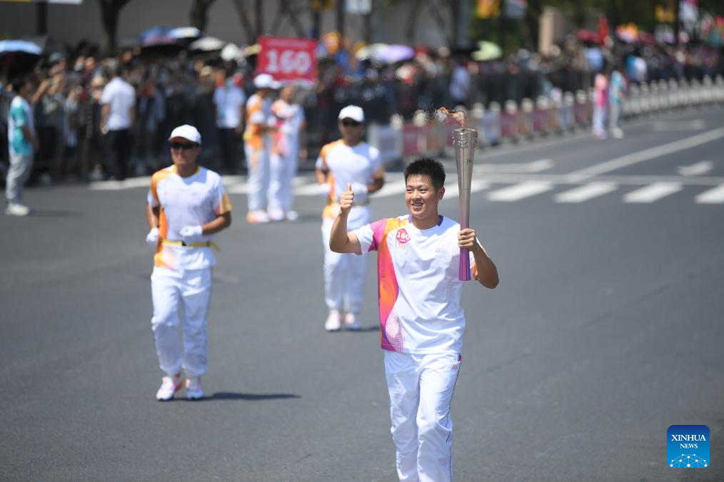 Torch bearer Wang Junjie runs with the torch during the torch relay of the 19th Asian Games in Wenzhou, east China's Zhejiang Province, Sept. 15, 2023. (Xinhua/Weng Xinyang)