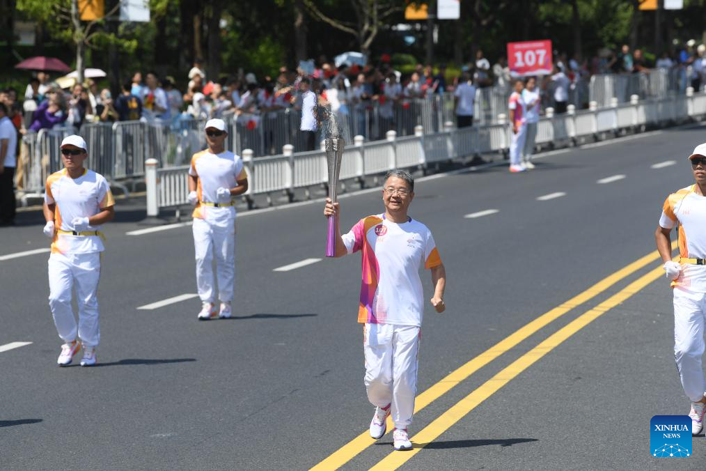 Torch bearer He Changzhen runs with the torch during the torch relay of the 19th Asian Games in Wenzhou, east China's Zhejiang Province, Sept. 15, 2023. (Xinhua/Weng Xinyang)