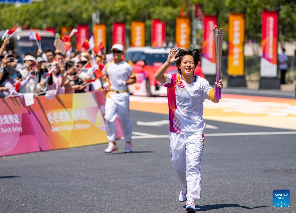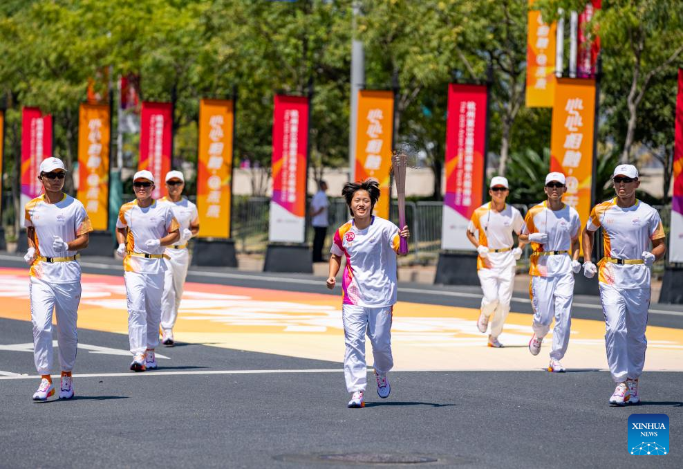 Torch bearer Sun Jing runs with the torch during the torch relay of the 19th Asian Games in Wenzhou, east China's Zhejiang Province, Sept. 15, 2023. (Xinhua/Weng Xinyang)