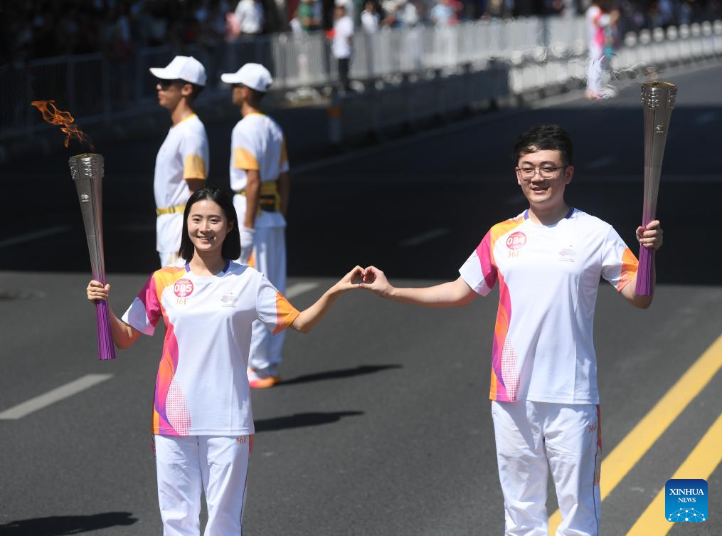 Torch bearers Wang Zizhen (R) and Xiang Zhenzhen pose during the torch relay of the 19th Asian Games in Wenzhou, east China's Zhejiang Province, Sept. 15, 2023. (Xinhua/Weng Xinyang)