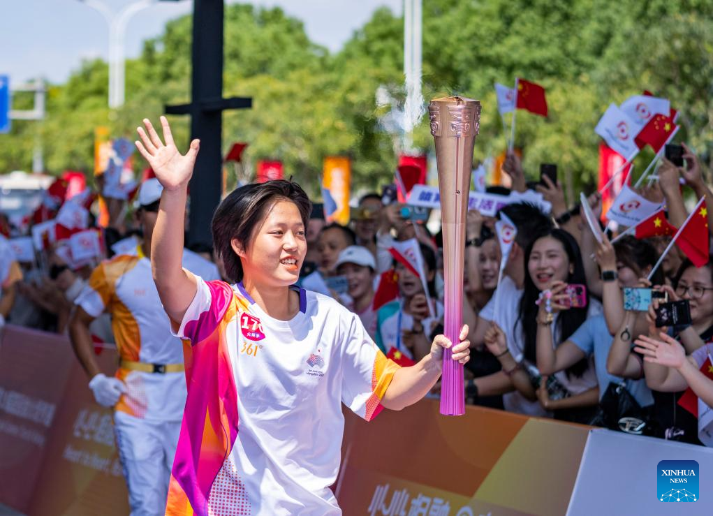 Torch bearer Fang Yuting runs with the torch during the torch relay of the 19th Asian Games in Wenzhou, east China's Zhejiang Province, Sept. 15, 2023. (Xinhua/Sun Fei)