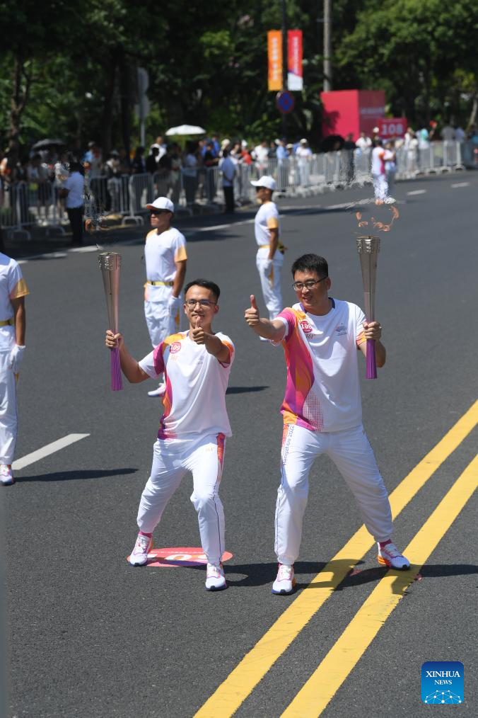 Torch bearers Chen Yonggai (R) and He Yixin pose during the torch relay of the 19th Asian Games in Wenzhou, east China's Zhejiang Province, Sept. 15, 2023. (Xinhua/Weng Xinyang)