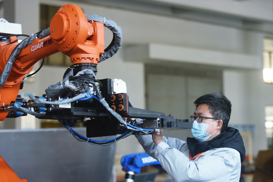An engineer tests an industrial robot at a workshop in Hangzhou, east China's Zhejiang Province, Jan. 17, 2022. (Photo by Long Wei/Xinhua)