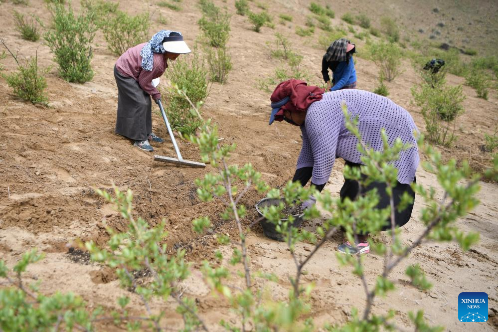 Villagers sow grass seeds on a grassland management point along the Yellow River in Oula Town of Maqu County, Gannan Tibetan Autonomous Prefecture, northwest China's Gansu Province, July 6, 2023.