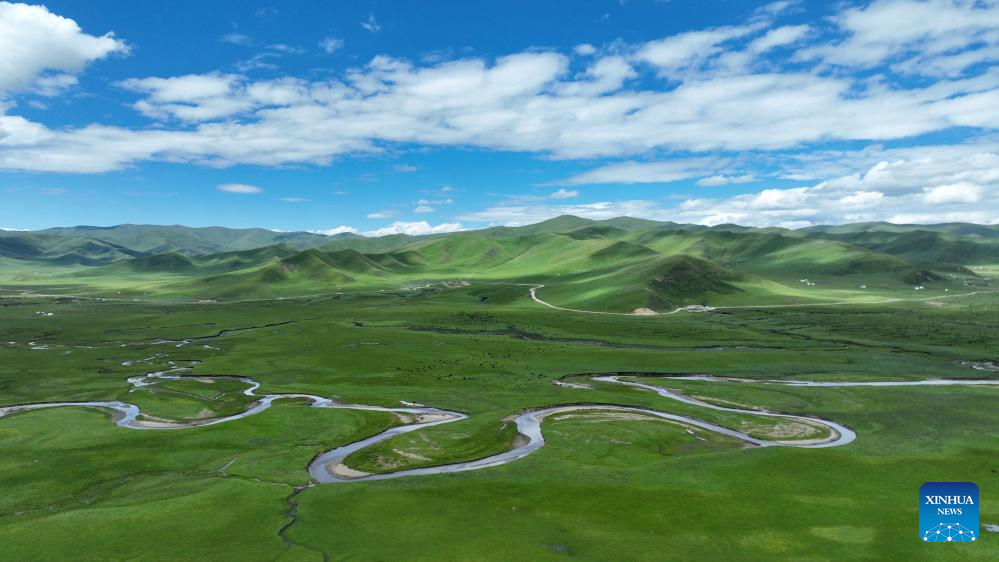 This aerial photo taken on July 6, 2023 shows the scenery of the Awancang Wetland in Maqu County, Gannan Tibetan Autonomous Prefecture of northwest China's Gansu Province.