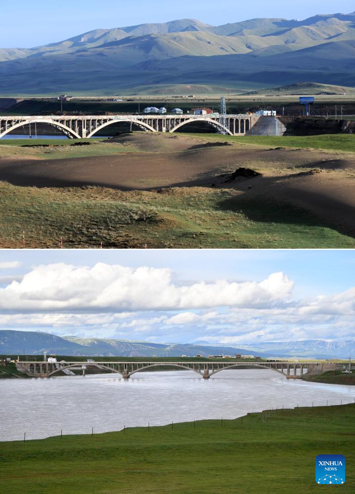 This combo photo shows a degraded grassland (above, photo taken by Xinhua photographer Nie Jianjiang on June 10, 2011) and the grassland after restoration (below, photo taken by Xinhua photographer Chen Bin on July 6, 2023) near the Yellow River bridge in Maqu County, Gannan Tibetan Autonomous Prefecture, northwest China's Gansu Province.
