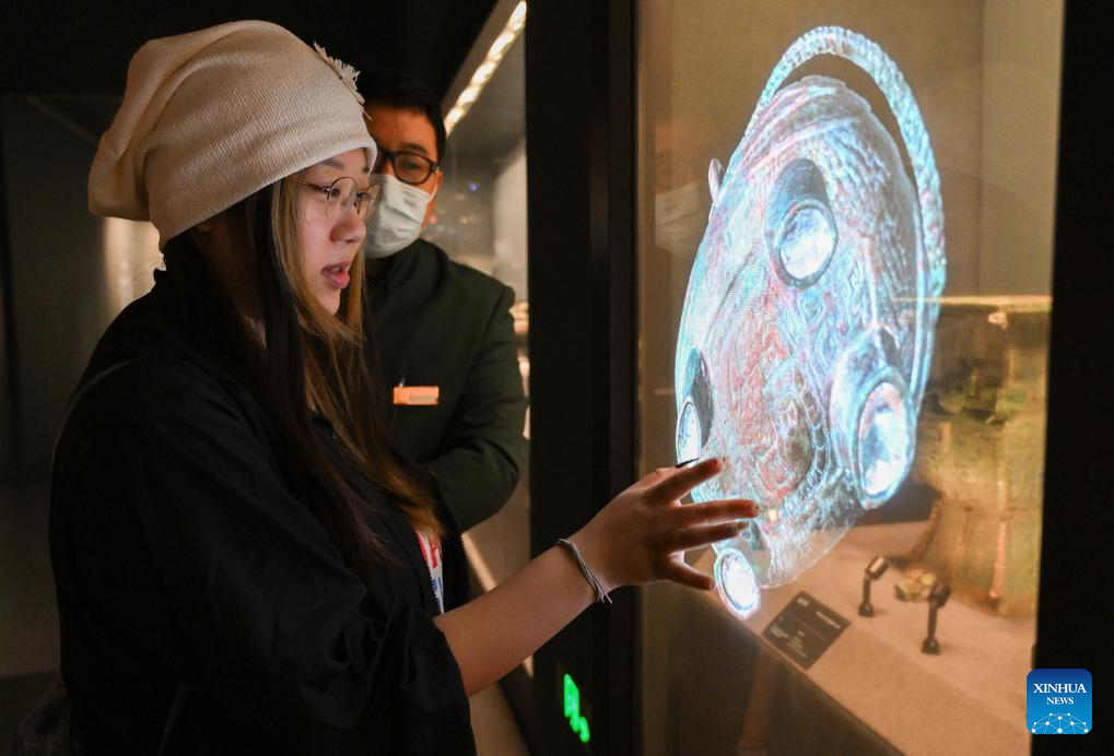 A visitor tries an interaction device at the Chinese Archaeological Museum in Beijing, capital of China, Sept. 15, 2023. The Chinese Archaeological Museum was opened to the public on Friday. (Xinhua/Li He)