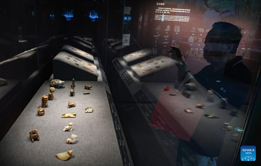 A visitor takes photos of exhibits at the Chinese Archaeological Museum in Beijing, capital of China, Sept. 15, 2023. The Chinese Archaeological Museum was opened to the public on Friday. (Xinhua/Li He)