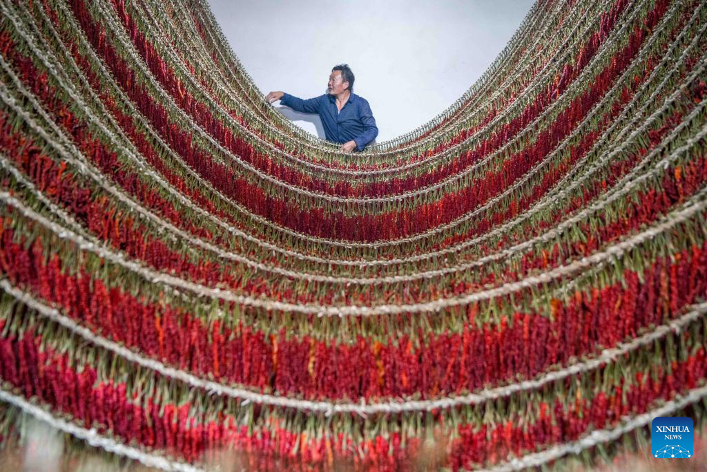 This photo taken on Sept. 14, 2023 shows hot peppers being aired in Renxiaomiao Village of Bozhou, east China's Anhui Province. (Photo by Liu Qinli/Xinhua)
