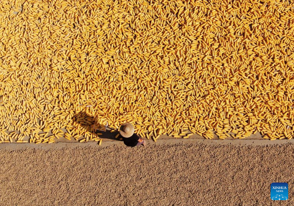 This aerial photo shows a farmer airing corns and peanuts in Dongjiazhuang Village of Linyi, east China's Shandong Province, Sept. 14, 2023. (Photo by Wu Jiquan/Xinhua)