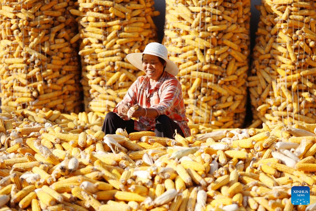 Farmers harvest corns in the field in Sunzhuang Village of Shangqiu, central China's Henan Province, Sept. 14, 2023. (Photo by Wang Gaochao/Xinhua)