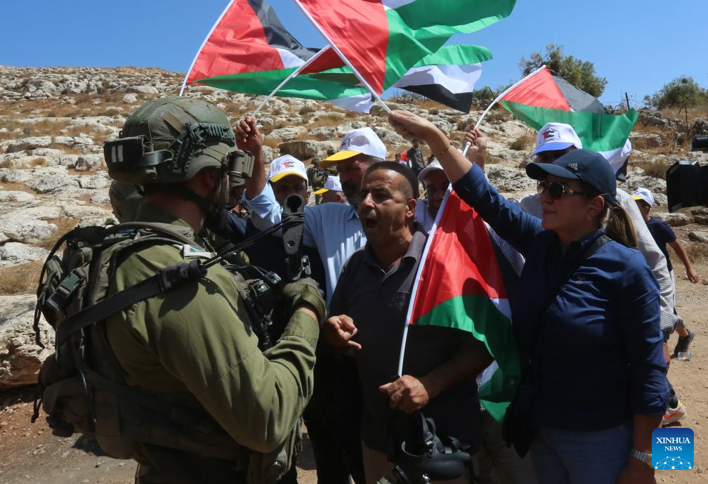 Palestinian protesters clash with Israeli security forces following a protest against the expansion of Jewish settlements in the West Bank village of Qaryut, south of Nablus, on Sept. 15, 2023. (Photo by Ayman Nobani/Xinhua)