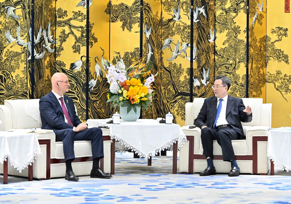 Chinese Vice Premier Ding Xuexiang, also a member of the Standing Committee of the Political Bureau of the Communist Party of China Central Committee, meets with First Deputy Prime Minister of Kazakhstan Roman Sklyar after the opening ceremony of the China-Europe Railway Express Cooperation Forum in Lianyungang, east China's Jiangsu Province, Sept. 15, 2023.