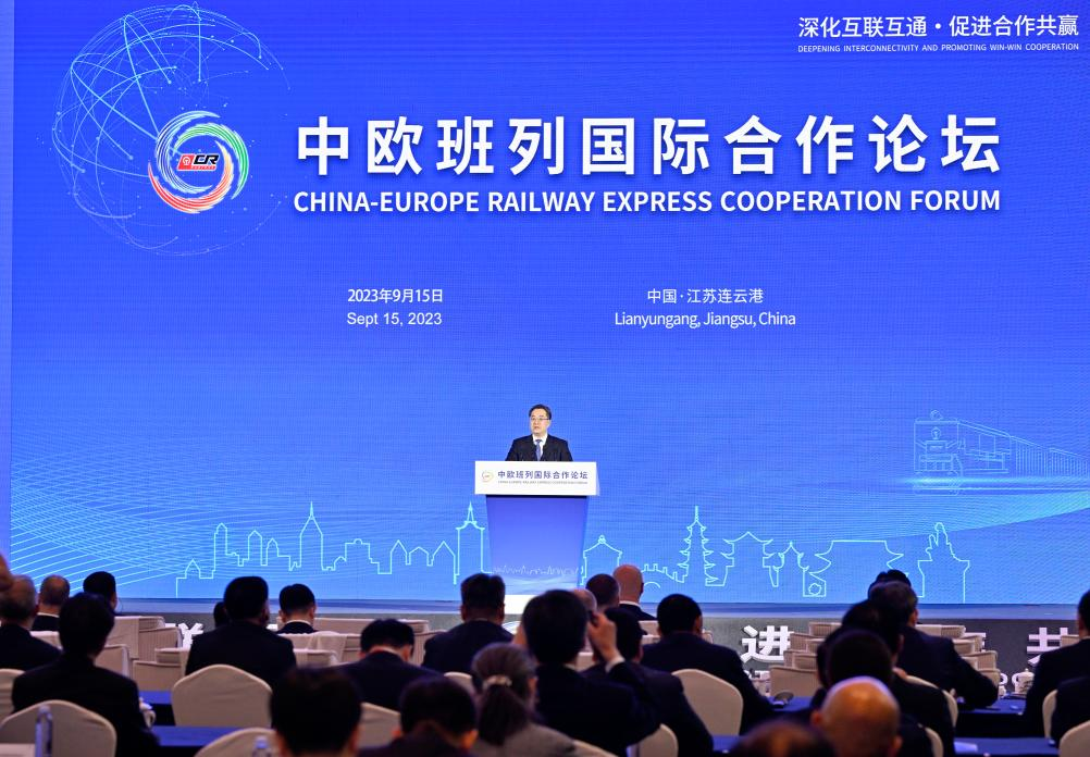 NANJING, Sept. 15 (Xinhua) -- Chinese Vice Premier Ding Xuexiang read a congratulatory letter from Chinese President Xi Jinping at the opening ceremony of the China-Europe Railway Express Cooperation Forum on Friday in Lianyungang, east China's Jiangsu Province, and delivered a speech, calling for joint efforts to develop the China-Europe Railway Express.
