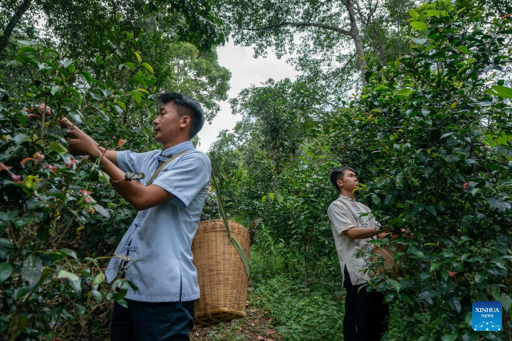 Farmers pick tea leaves at an old tea forest area of Jingmai Mountain in Pu'er, southwest China's Yunnan Province, Sept. 14, 2023. (Xinhua/Hu Chao)