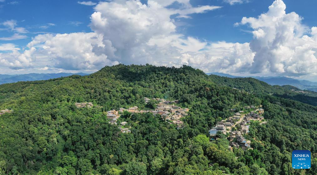 This aerial photo taken on Aug. 29, 2023 shows a traditional village surrounded by forests and tea gardens in Jingmai Mountain in Pu'er, southwest China's Yunnan Province. (Xinhua/Li He)