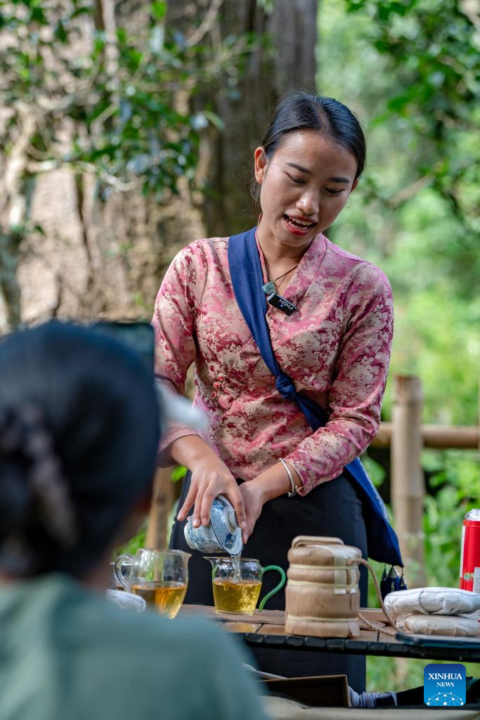 A villager promotes tea via livestreaming at an old tea forest area of Jingmai Mountain in Pu'er, southwest China's Yunnan Province, Sept. 14, 2023. (Xinhua/Hu Chao)