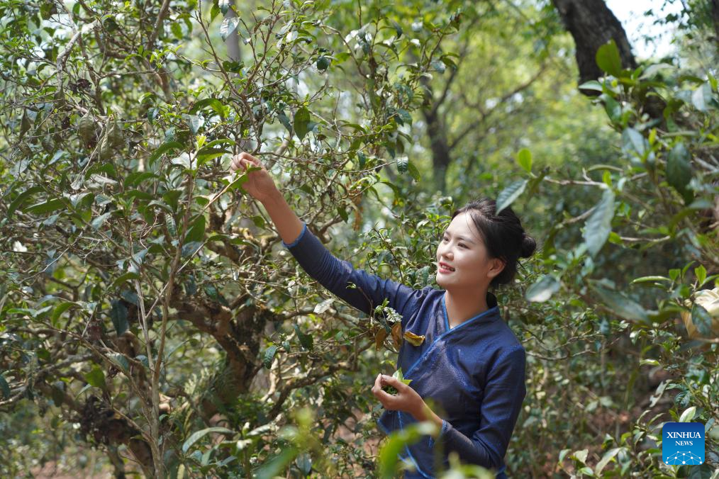 A farmer picks tea leaves at an old tea forest area of Jingmai Mountain in Pu'er, southwest China's Yunnan Province, April 19, 2023. (Photo by Lu Lei/Xinhua)