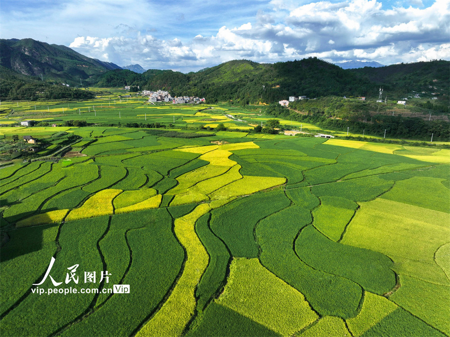 Photo shows rice fields and dwellings nearby in Liufeng townsip, Guiyang county, Chenzhou city, central China's Hunan Province. (vip.people.com.cn/ Zhou Xiuyuchun)