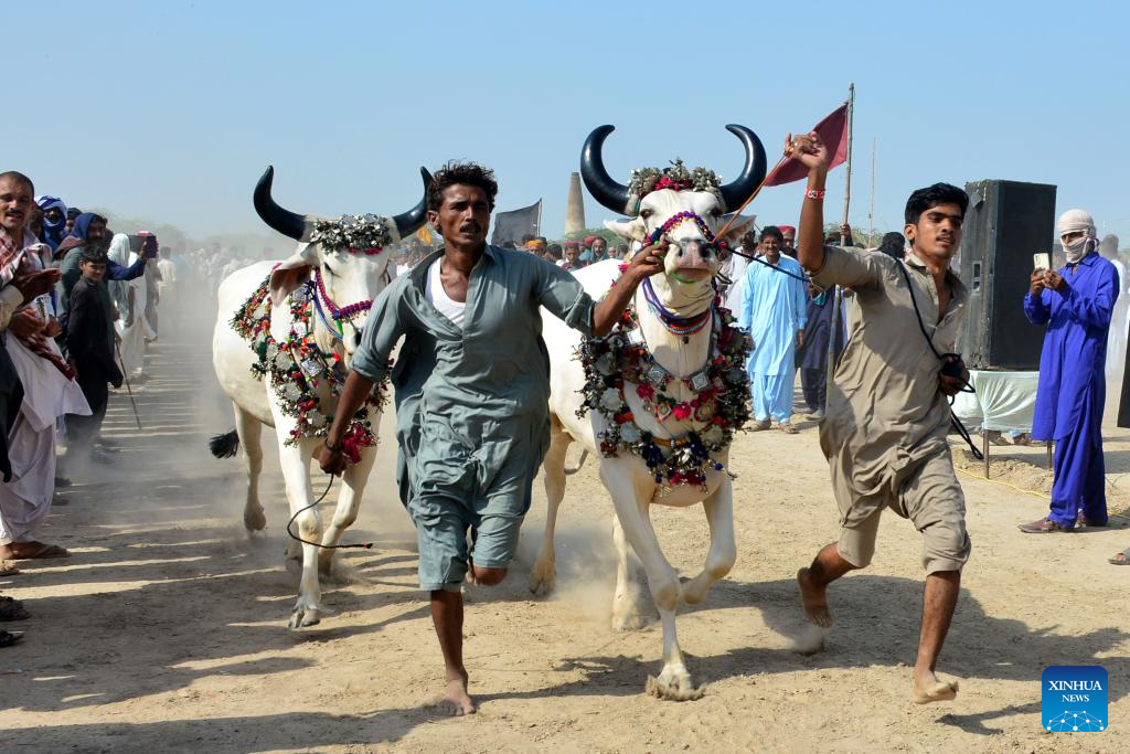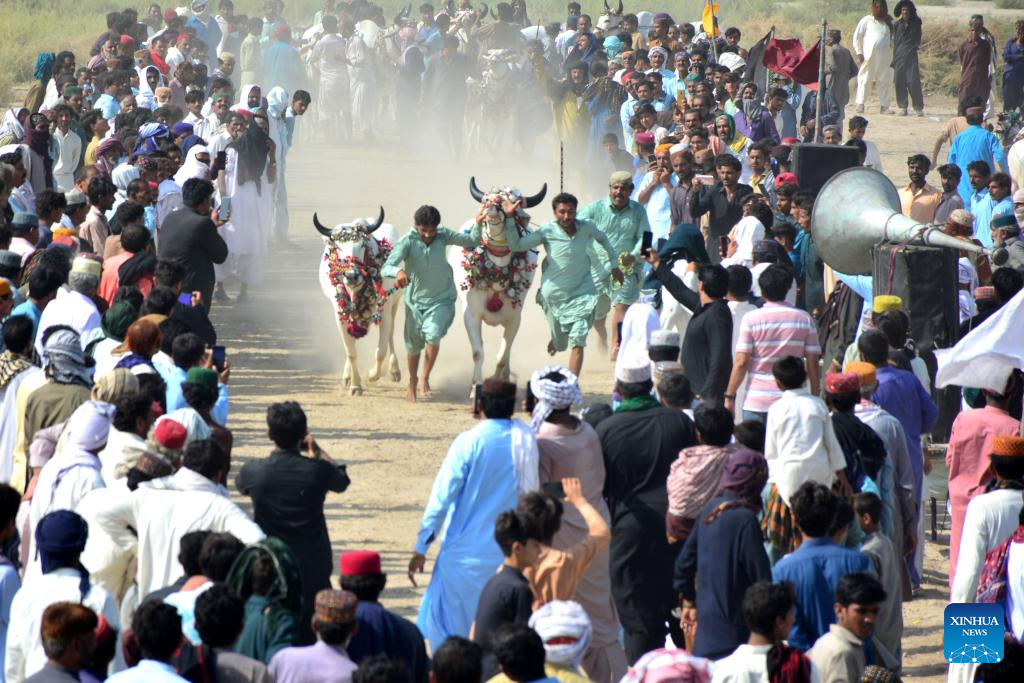 Farmers run with their cattle during a traditional cattle race on the outskirts of southern Pakistan's Hyderabad on Sept. 17, 2023. (Str/Xinhua)