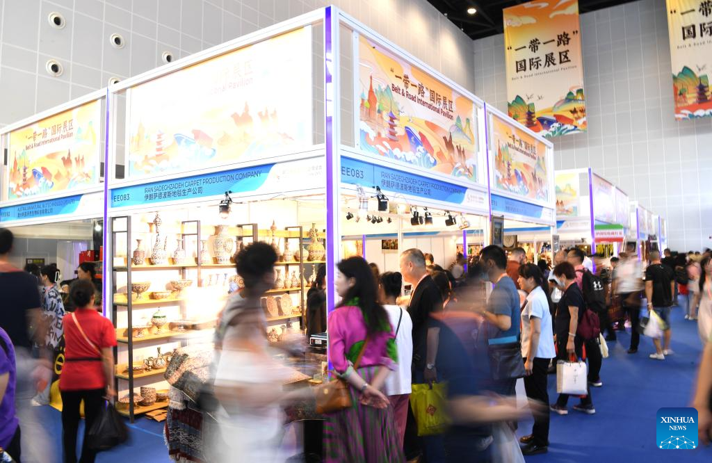 People select products at Belt and Road International Pavilion during the 20th China-ASEAN Expo at Nanning International Convention and Exhibition Center in Nanning, capital of south China's Guangxi Zhuang Autonomous Region, Sept. 17, 2023. The opening ceremony of the 20th China-ASEAN Expo and China-ASEAN Business and Investment Summit was held on Sunday in Nanning. (Xinhua/Zhou Hua)