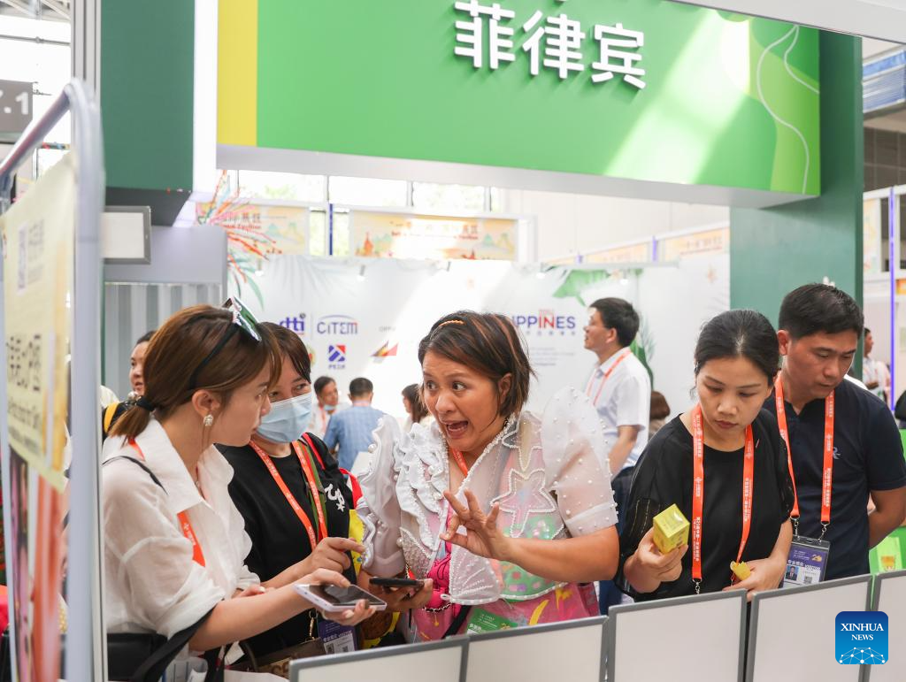 People buy skin care products from the Philippines during the 20th China-ASEAN Expo at Nanning International Convention and Exhibition Center in Nanning, capital of south China's Guangxi Zhuang Autonomous Region, Sept. 17, 2023. The opening ceremony of the 20th China-ASEAN Expo and China-ASEAN Business and Investment Summit was held on Sunday in Nanning. (Xinhua/Hu Xingyu)