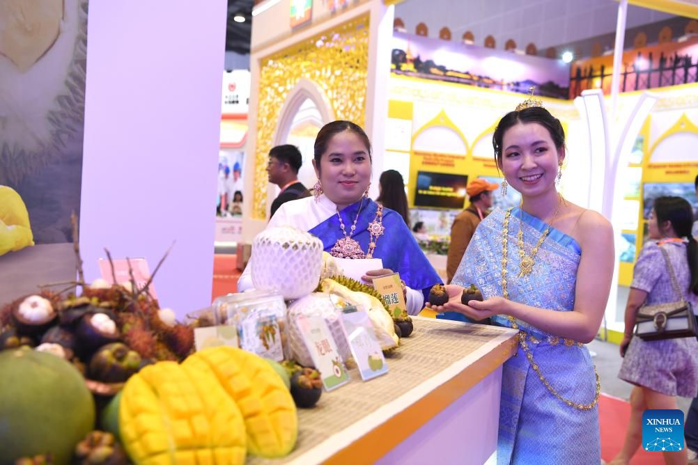 Exhibitors display fruits from Thailand during the 20th China-ASEAN Expo at Nanning International Convention and Exhibition Center in Nanning, capital of south China's Guangxi Zhuang Autonomous Region, Sept. 17, 2023. The opening ceremony of the 20th China-ASEAN Expo and China-ASEAN Business and Investment Summit was held on Sunday in Nanning. (Xinhua/Zhou Hua)