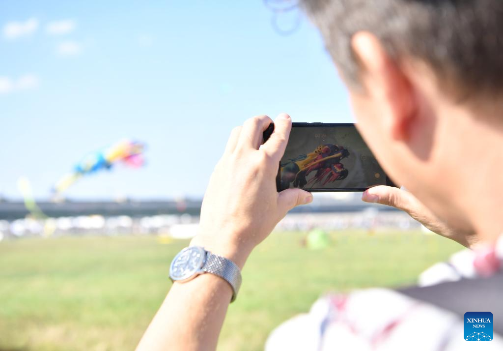 A man takes photos of a flying kite during the Giant Kite Festival in Berlin, Germany, Sept. 16, 2023. (Xinhua/Ren Pengfei)