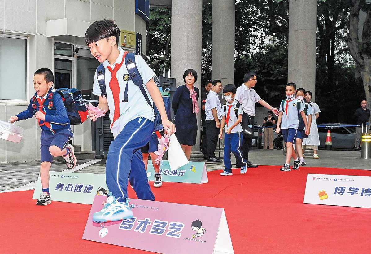 Teachers encourage students to jump over "hurdles" to welcome the new semester at an elementary school in Hangzhou, Zhejiang province, on Aug 31, 2023. [Photo by Dong Xuming/For China Daily]