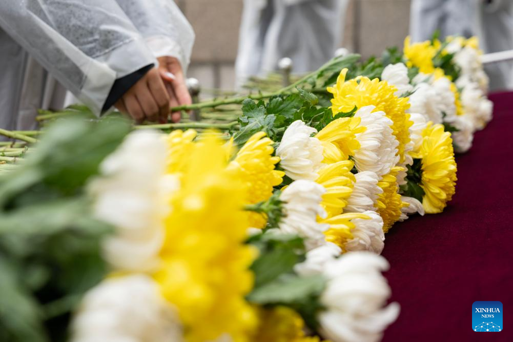 A staff member arranges flowers at the Exhibition Hall of Evidence of Crime Committed by Unit 731 of the Japanese Imperial Army in Harbin, northeast China's Heilongjiang Province, Sept. 18, 2023.