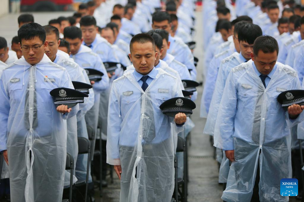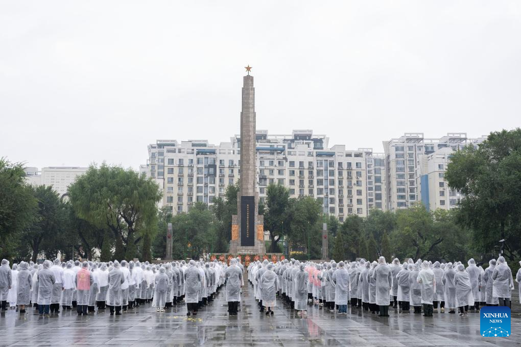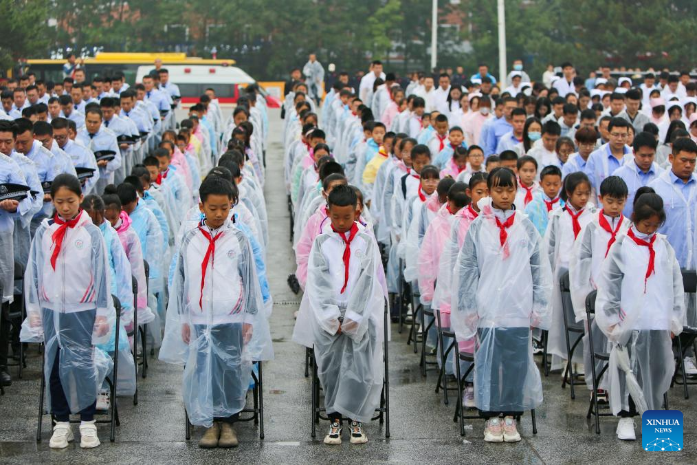 People participate in an event to commemorate the 92nd anniversary of the September 18 Incident at Changqing Park in Harbin, northeast China's Heilongjiang Province, Sept. 18, 2023.
