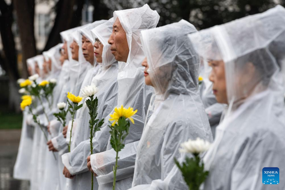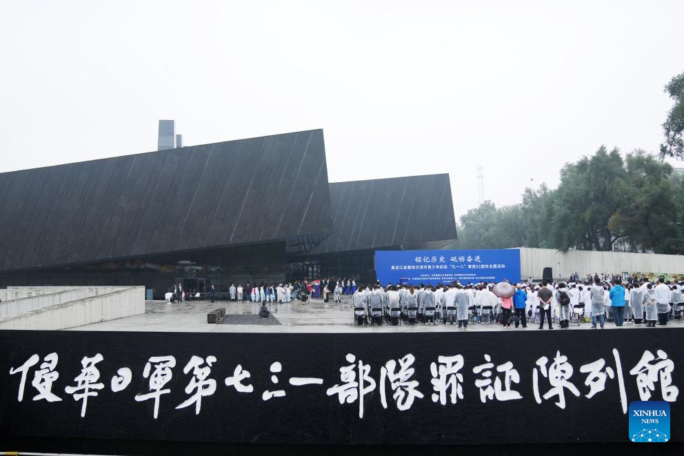 People participate in an event to commemorate the 92nd anniversary of the September 18 Incident at the square of the Exhibition Hall of Evidence of Crime Committed by Unit 731 of the Japanese Imperial Army in Harbin, northeast China's Heilongjiang Province, Sept. 18, 2023.