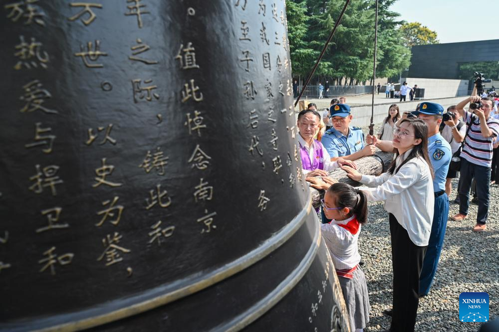 People strike the Bell of Peace at the Memorial Hall of the Victims in Nanjing Massacre by Japanese Invaders in Nanjing, east China's Jiangsu Province, Sept. 18, 2023.