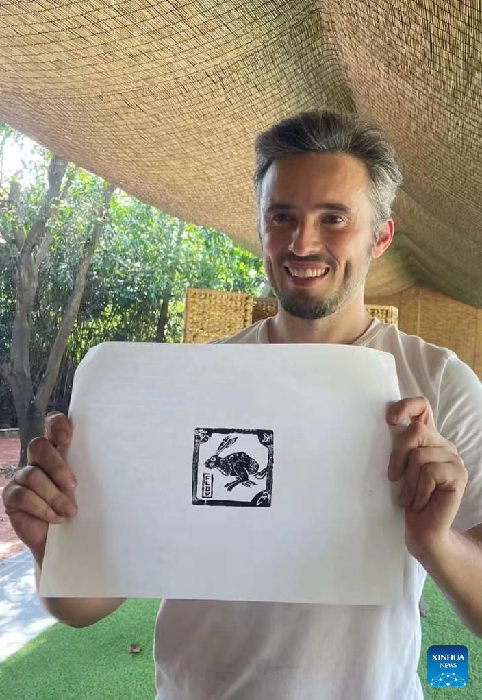 French designer Johannes Faure-Brac displays a seal featuring the Year of the Rabbit in Zhongshan, south China's Guangdong Province, July 10, 2023. (Xinhua)