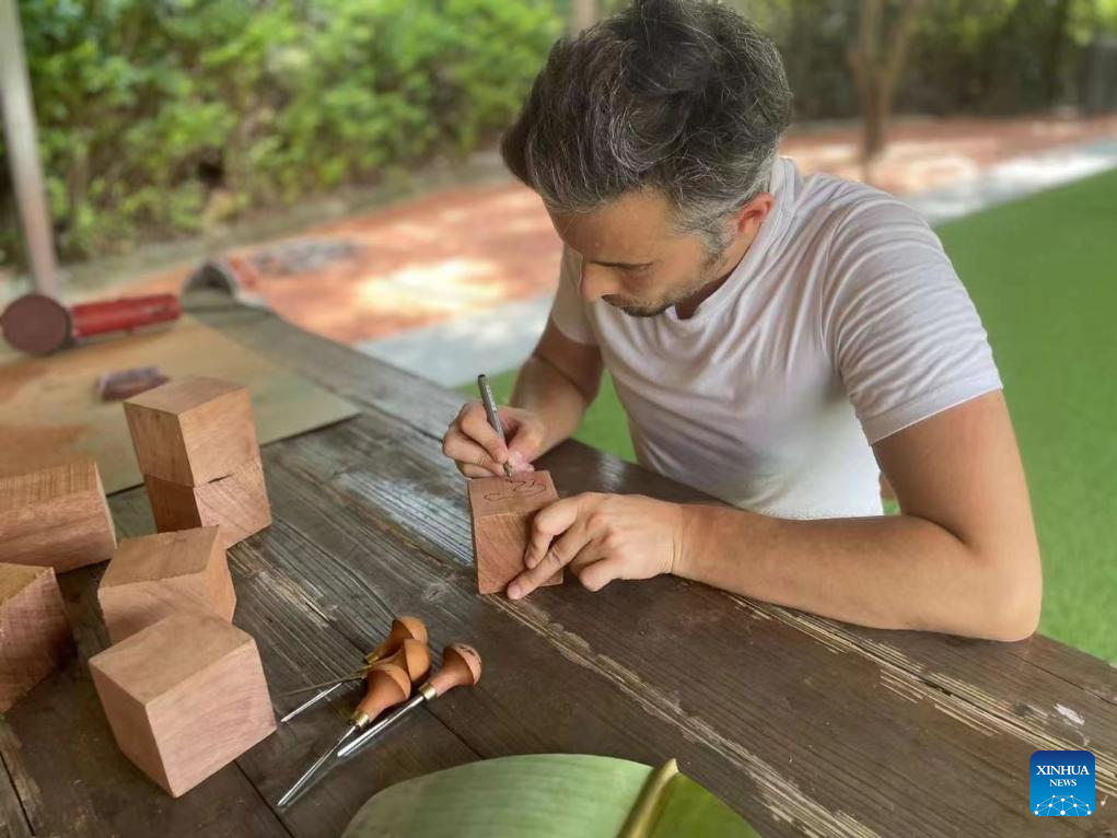 French designer Johannes Faure-Brac makes a seal in Zhongshan, south China's Guangdong Province, July 10, 2023. (Xinhua)
