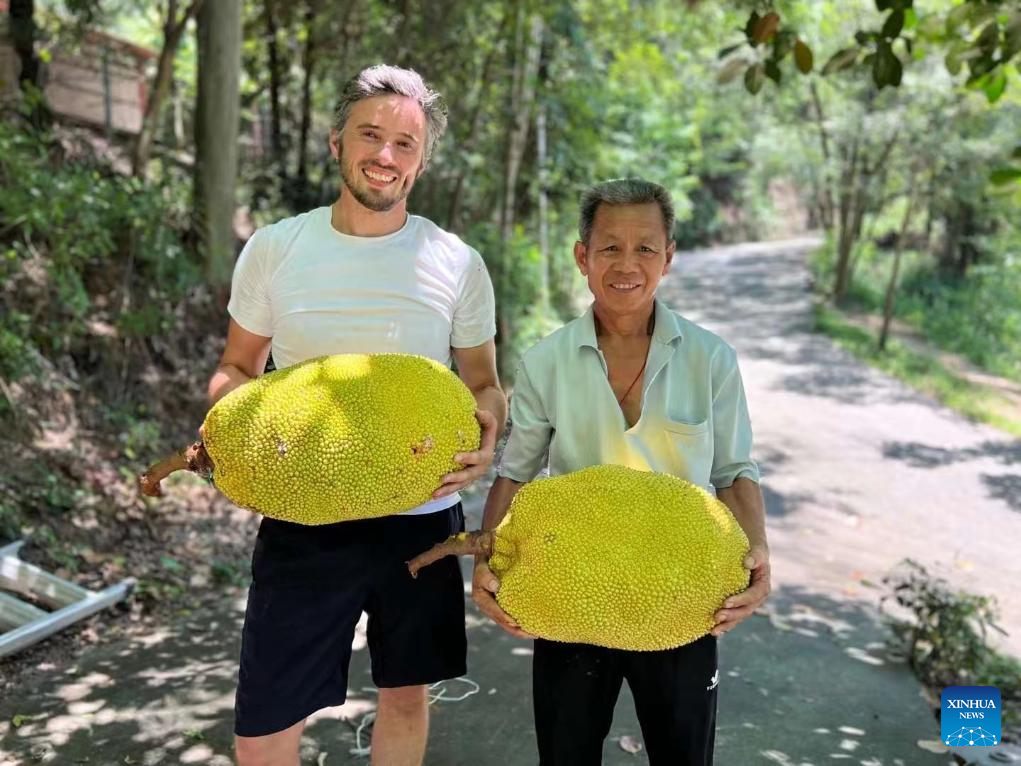 French designer Johannes Faure-Brac and a farmer display newly-picked jackfruits in Zhongshan, south China's Guangdong Province, July 25, 2023. (Xinhua)