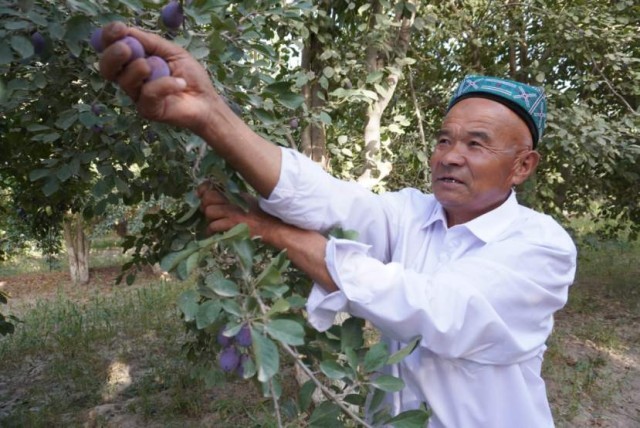 A farmer picks plums at an orchard in Jiashi county, northwest China's Xinjiang Uygur Autonomous Region. (People's Daily/Bai Yang)