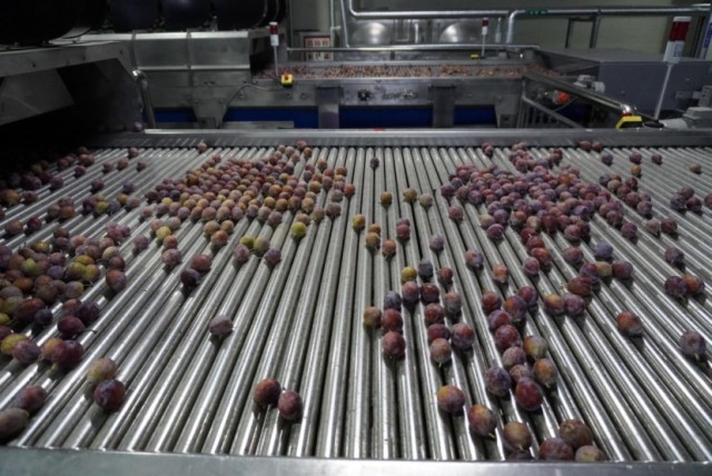 Photo shows plums on a sorting machine. (People's Daily/Bai Yang)