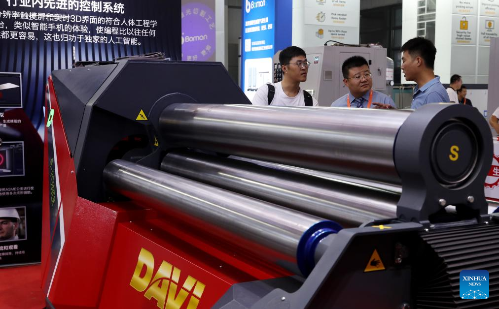 Visitors talk beside a four-roll plate rolling machine during the 23rd China International Industry Fair (CIIF) in east China's Shanghai, Sept. 19, 2023. The 23rd CIIF kicked off here on Tuesday, with the theme of "Digital Economy & Industrial Decarbonization." (Xinhua/Fang Zhe)