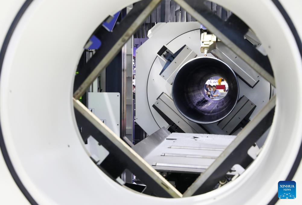 Visitors look at a pipe cutting machine during the 23rd China International Industry Fair (CIIF) in east China's Shanghai, Sept. 19, 2023. The 23rd CIIF kicked off here on Tuesday, with the theme of "Digital Economy & Industrial Decarbonization." (Xinhua/Fang Zhe)
