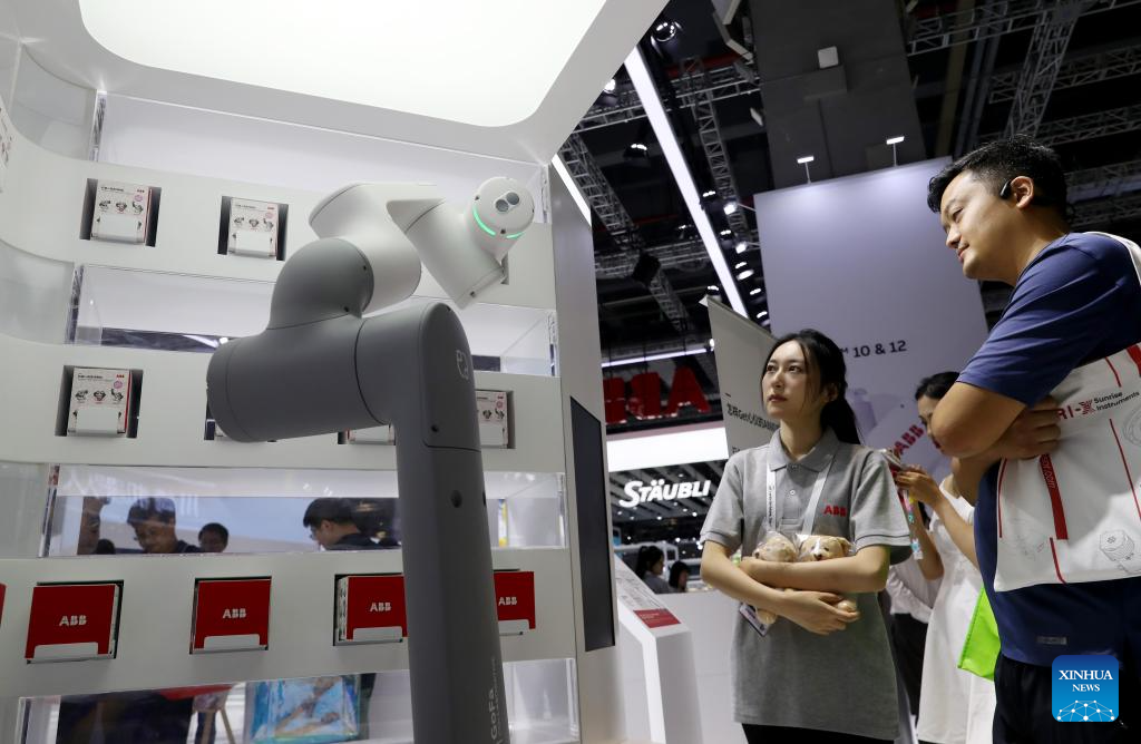 A service robot serves a visitor (R) during the 23rd China International Industry Fair (CIIF) in east China's Shanghai, Sept. 19, 2023. The 23rd CIIF kicked off here on Tuesday, with the theme of "Digital Economy & Industrial Decarbonization." (Xinhua/Fang Zhe)