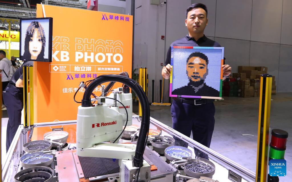 A staff member displays his blocks-made portrait during the 23rd China International Industry Fair (CIIF) in east China's Shanghai, Sept. 19, 2023. The 23rd CIIF kicked off here on Tuesday, with the theme of "Digital Economy & Industrial Decarbonization." (Xinhua/Fang Zhe)