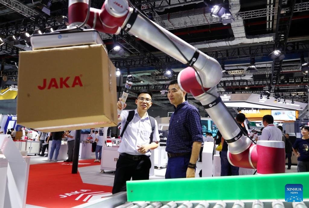 Visitors watch a robot transferring a box during the 23rd China International Industry Fair (CIIF) in east China's Shanghai, Sept. 19, 2023. The 23rd CIIF kicked off here on Tuesday, with the theme of "Digital Economy & Industrial Decarbonization." (Xinhua/Fang Zhe)