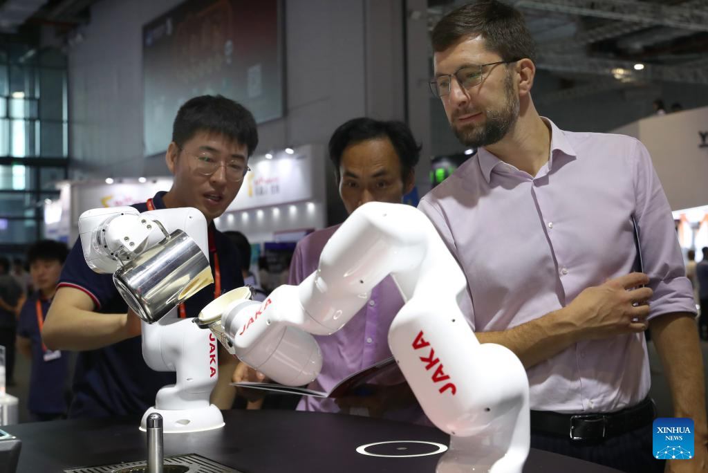 Visitors watch a robot making coffee during the 23rd China International Industry Fair (CIIF) in east China's Shanghai, Sept. 19, 2023. The 23rd CIIF kicked off here on Tuesday, with the theme of "Digital Economy & Industrial Decarbonization." (Xinhua/Fang Zhe)
